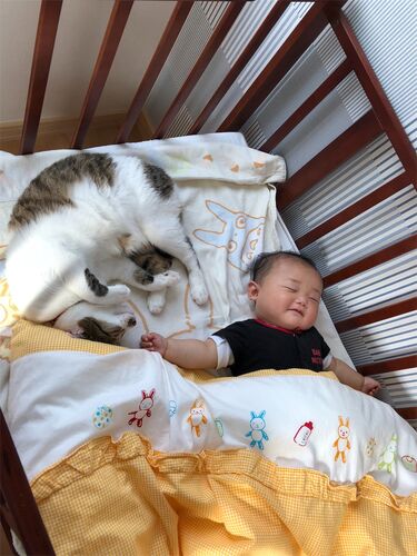 朝、第4子を起こしに行くともう1人いました。 ベビーベッドが大好きな猫。 窓から日射しが入って暖かいからか、昼間はココにいる事がほとんどです。 だからベビーベッドはいつも毛だらけ。 隙あらば犬も第4子を舐め続けるし、肌が弱いのは犬、猫のせい?